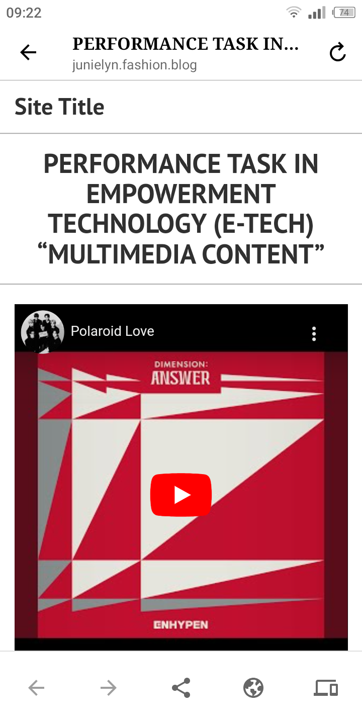 PERFORMANCE TASK IN EMPOWERMENT TECHNOLOGY (E-TECH) “MULTIMEDIA CONTENT” GO ON YOUTUBE SEARCH A MUSIC OF YOUR CHOICE GO TO THE BOTTOM OF THE VIDEO AND CLICK THE “SHARE” BUTTON COPY THE CODE CREATE A NEW POST ON YOUR WORDPRESS THEN ON THE EDITOR , PASTE YOUR CODE. PREVIEW PUBLISH THE CONTENT